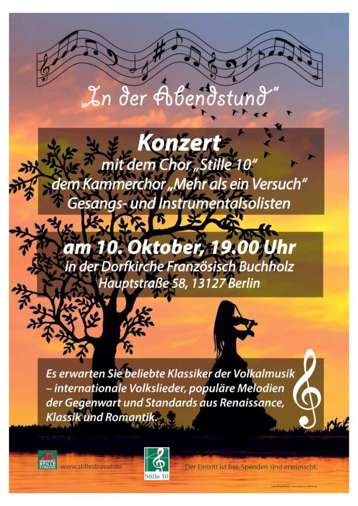 „In der Abendstund´“ laden wir, der Chor „Stille 10“, herzlich zum Konzert ein. Als gemischter Chor des Fördervereins Stille Straße 10 e.V. bestehen wir seit 12 Jahren und singen zu vielen Anlässen an unterschiedlichen Orten Berlins, allein oder mit anderen Chören zusammen. Zu unserem Repertoire gehören Lieder aus 500 Jahren Musikgeschichte – nationale und internationale Volkslieder und Kompositionen bekannter Komponisten.